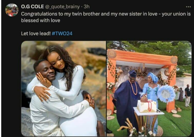 The groom’s twin sister, Kenny Cole, congratulated her twin brother and his wife, Wofai Fada, on their marriage in a post on the microblogging site X.