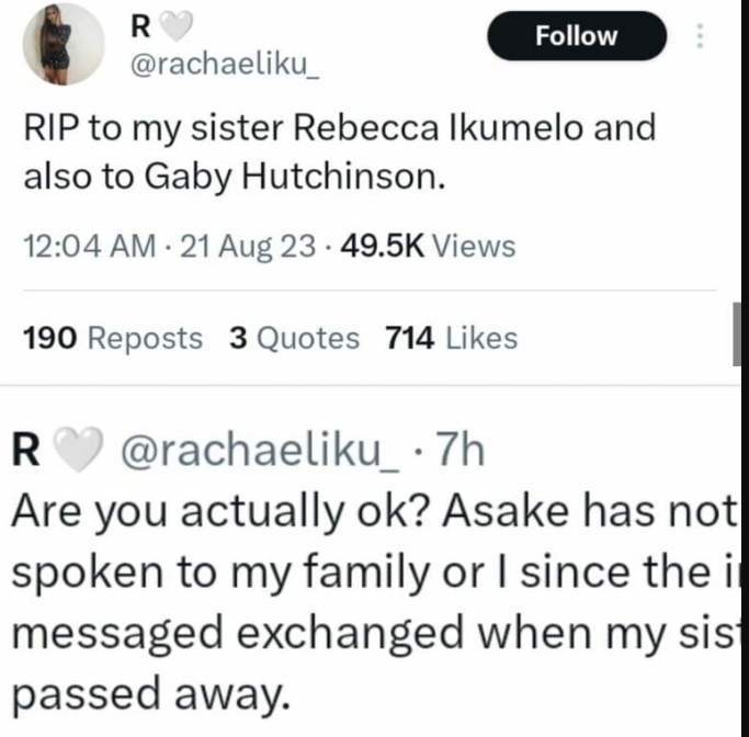 “Are you actually ok? Asake has not spoken to my family or I since the initial message exchanged when my sister passed away”, she tweeted.
