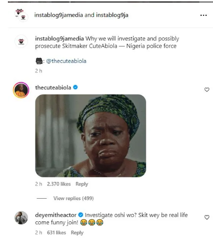 Berating the Force, Cute Abiola took to the comment section of Instablog9ja where he dropped a motion emoji of veteran actress Iya Awero (Lanre Hassan) scoffing, meaning he is not afraid of them and by extension gets social media backing.