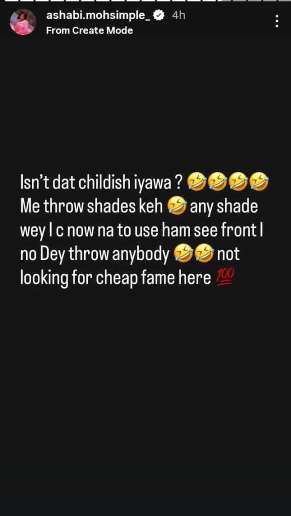 Ashabi Simple quickly fired back on her Instagram Story, calling Bewaji’s posts childish. She wrote: “Isn’t that childish, Iyawa? Me throw shades keh? Any shade wey I c now na to use ham see front. I no dey throw anybody. Not looking for cheap fame here.”
