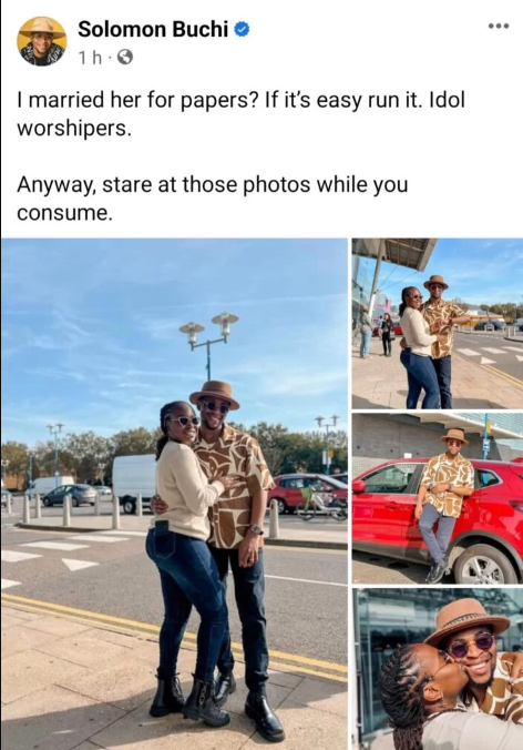 Solomon Buchi, a Nigerian writer and social media personality, has slammed those who believe he married his British-Nigerian wife, Arike Adeola, for citizenship.