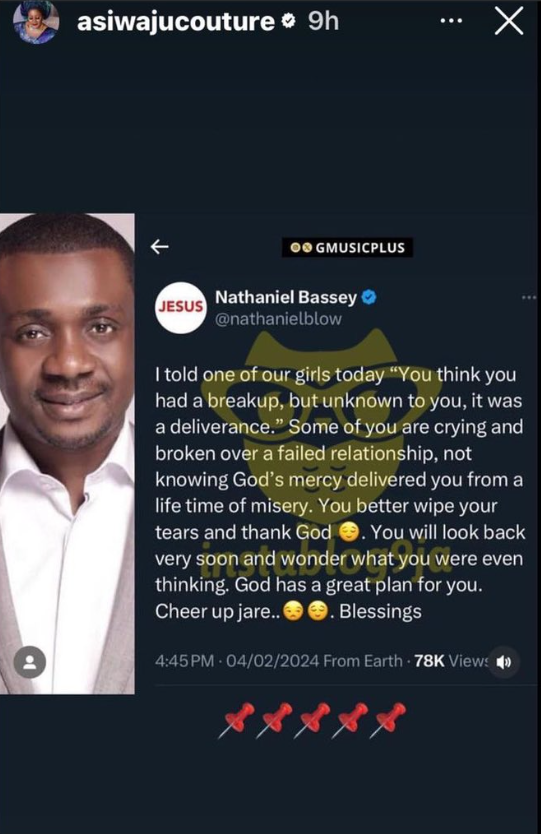 - “I told one of our girls today, ‘You think you had a break-up, but unknown to you, it was a deliverance. Some of you are crying and broken over a failed relationship, not knowing God’s mercy delivered you from a lifetime of misery. You better wipe your tears and thank God. You will look back very soon and wonder what you were even thinking. God has a great plan for you. Cheer up jare. Blessings,’” Nathaniel Bassey wrote.