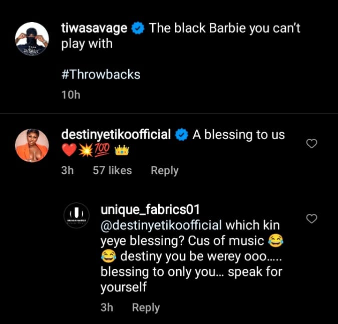 Actress, Destiny Etiko ignited backlash from a troll over her comment on Nigerian singer., Tiwa Savage’s recent post.