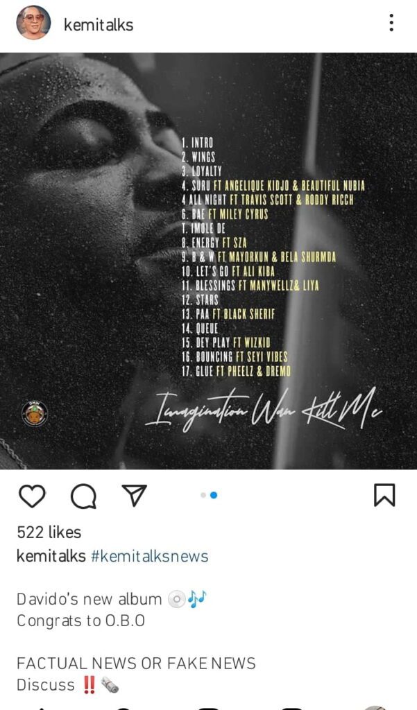 “Davido’s new album. Congrats to O.B.O. Factual news or fake news. Discuss”.