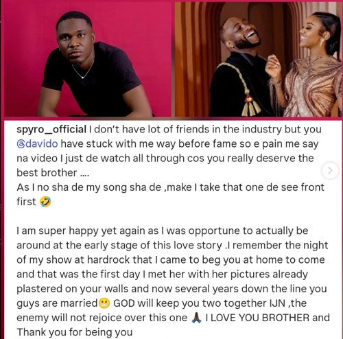 He also expressed appreciation for Davido’s support over the years. Spyro wrote, “I don’t have a lot of friends in the industry but you, @davido, have stuck with me way before fame so e pain me say na video I just de watch all through cos you really deserve the best brother.”