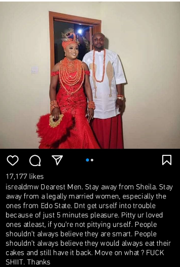 “Dearest Men. Stay away from Sheila. Stay away from a legally married women, especially the ones from Edo State. Dnt get urself into trouble because of just 5 minutes pleasure. Pitty ur loved ones atleast, if you’re not pittying urself. People shouldn’t always believe they are smart. People shouldn’t always believe they would always eat their cakes and still have it back. Move on what ? FUK SHIIT. Thanks,” he wrote.