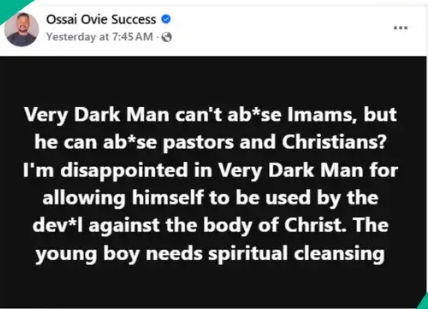 “Very Dark Man can’t abuse Imams, but he can abuse pastors and Christians? I’m disappointed in Very Dark Man for allowing himself to be used by the devil against the body of Christ. The young boy needs spiritual cleansing,” he wrote.