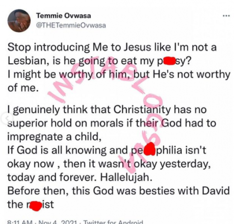 Temmie Ovwasa for some reason took to social media to spew some abominable words asking those introducing Jesus Christ to her in an attempt of changing her life to stop doing that because she thinks He’s not worthy of her.