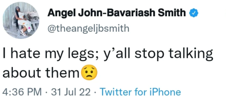 “You have nice. legs though. I don’t really know why you would say you h@te your legs. People love you because you have great legs.”