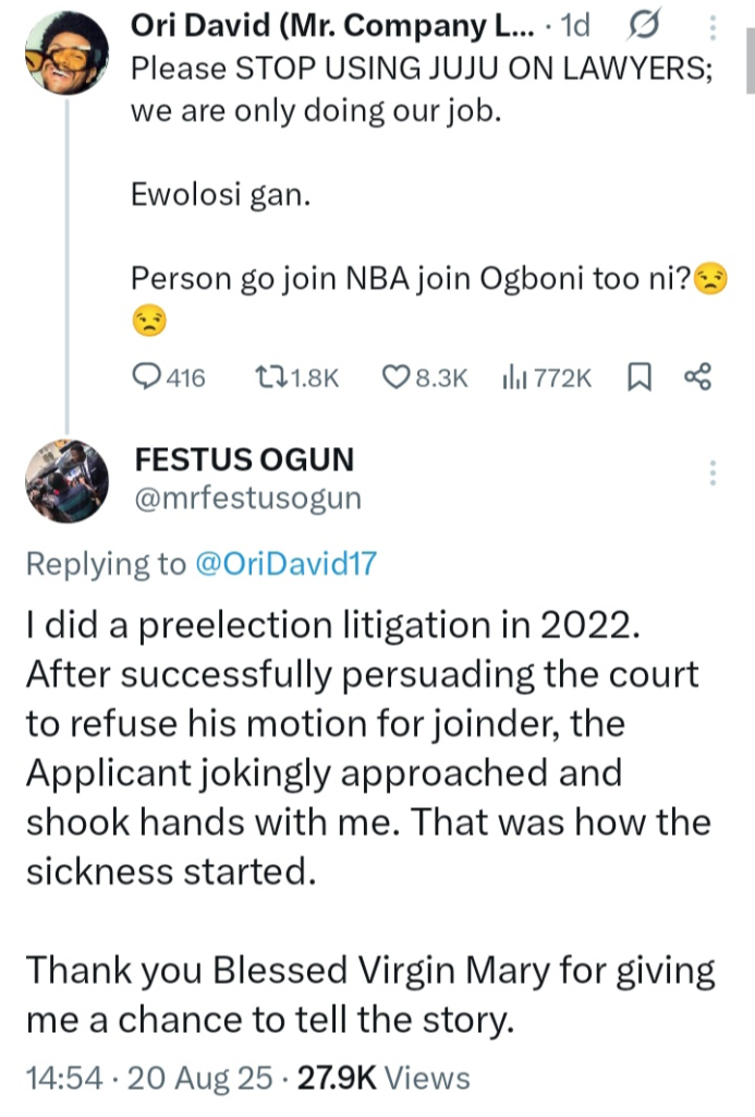In his post, the lawyer appealed to the public to stop employing “juju” against those in the legal profession, emphasizing that they are merely fulfilling their responsibilities.