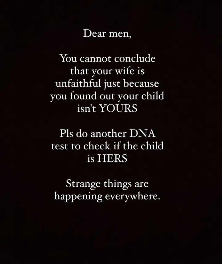Mary Njoku, who stressed that strange things are happening now, noted that a man should not conclude that his wife is unfaithful because his supposed child turned out not to be his.