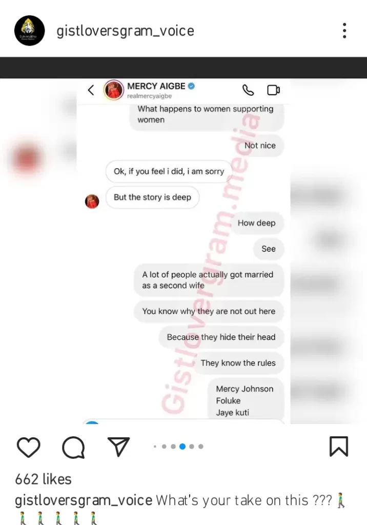 GISTLOVER shared a private conversation she had with Mercy Aigbe, had dragged Mercy Johnson into the discussion as she noted how the actress was also married to someone’s husband.