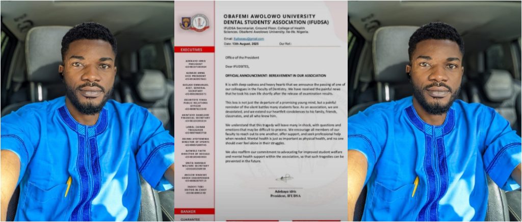 • According to a statement issued on Wednesday, August 13, 2025, by the President of the Dentistry Students’ Association, Adebayo Idris, the tragic incident occurred shortly after the release of examination results on August 12.
