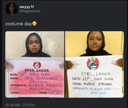 In a recent development, Irene, who appeared to be a fan of Bobriksy, copied his EFCC mugshot for her favored costume day attire.