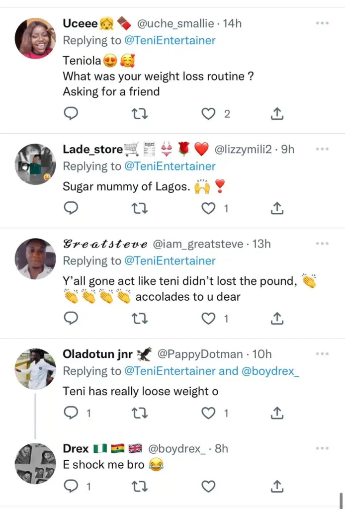 - Teni shared a couple of photos via her Insta-story, where she now visibly looks younger and smarter