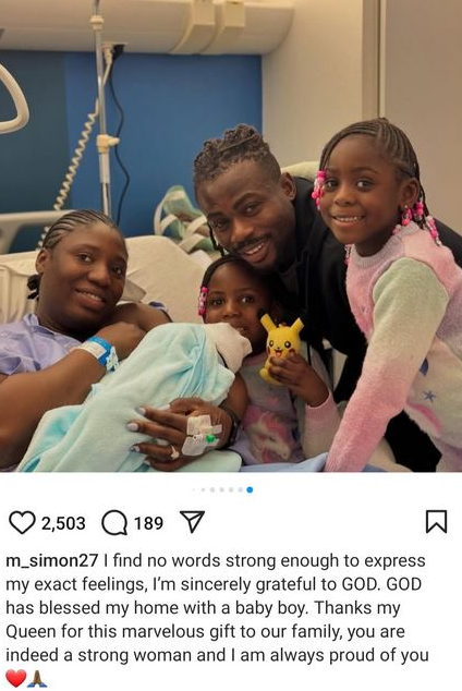 - Super Eagles player Moses Simon and his wife Ibukun Moses-Simon have welcomed their first son.