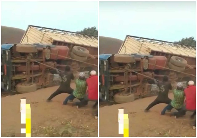 The scene which is surmised to have occurred somewhere in Nigeria, some couple of men could be seen using two ropes to fiercely pull at the toppled trailer with all their might and it surprisingly flipped over as they raced away, scared it might fall on them.
