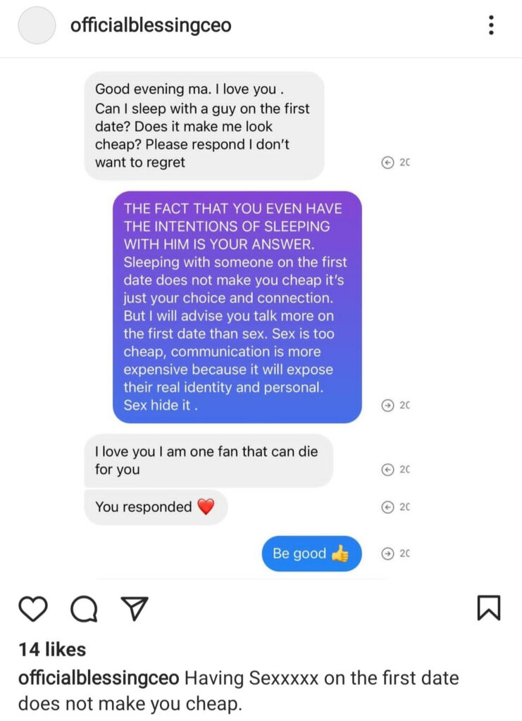 Blessing responded, telling the follower that sex on a first date doesn’t make one cheap. She added that it’s based on “choice and connection”.