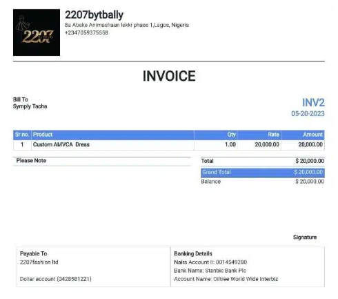 She also attached the invoice for her outfit which showed that it costs $20,000.
