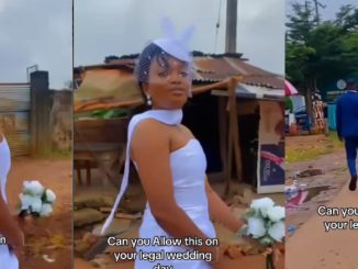 A Nigerian bride has become a viral sensation after she was filmed trekking to her court wedding while playfully lamenting her situation. The hilarious moment was recorded by a friend, who could be heard laughing