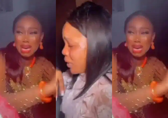 A viral video captures the moment a bride displayed absolute humility after the famous Nollywood actress, Mercy Johnson Okojie and her husband, Prince Odianosen Okojie stormed her wedding reception. In the clip, the couple were