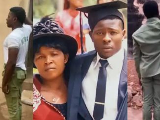 NYSC member Daniel Alagor honours his late mother with a moving graveside tribute in full corps uniform He removes his cap and jacket, placing them on her grave as a sign of respect and gratitude