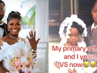 A Nigerian woman shared throwback photos on TikTok celebrating her marriage to a primary school classmate, who had once played the groom in a school “wedding” while she was the bride. The heartwarming post drew