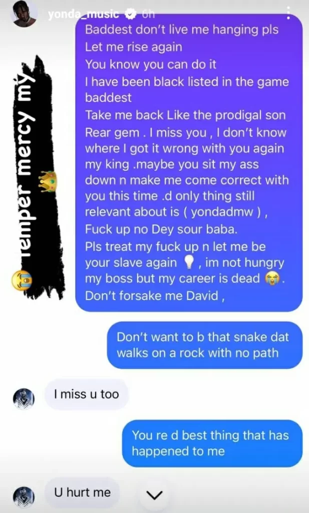 - Yonda took to social media to share a conversation he had with the Afrobeats star where he begged to be given another chance.