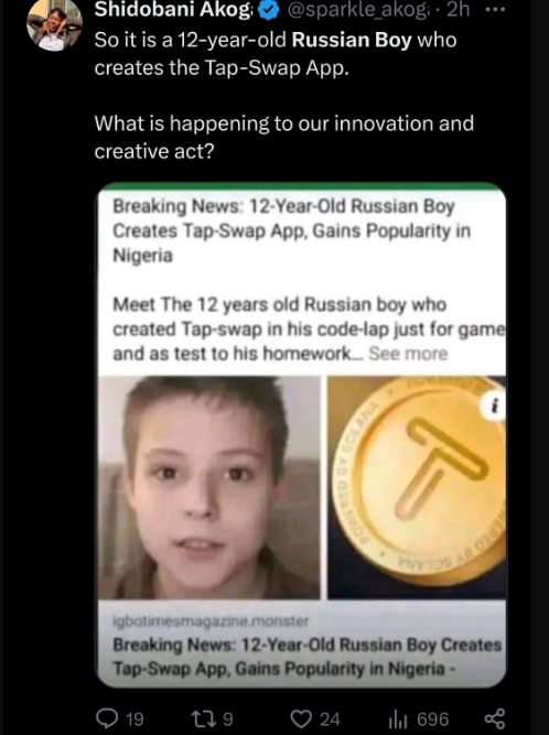 @sparkle_akoga: “So it is a 12-year-old Russian Boy who created the Tap-Swap App. What is happening to our innovation and creative act?”