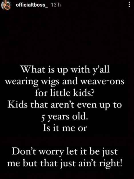 Ex-BBNaija housemate, TBoss has queried parents who put wigs and weave-ons on their kids.
