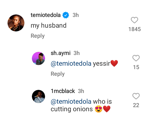 Temi Otedola referred to singer Mr Eazi as her “husband” after he celebrated her 27th birthday with her yesterday.