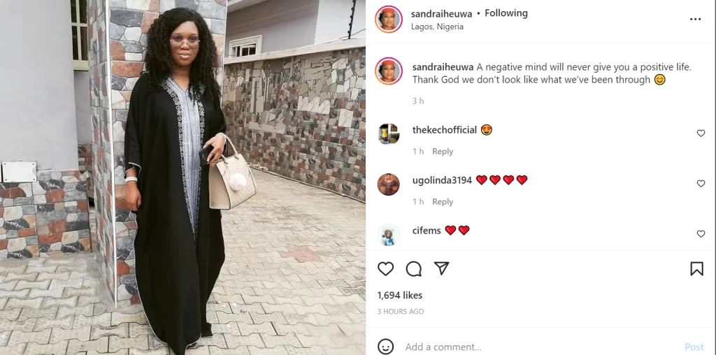 Nigerian businesswoman, Sandra Iheuwa has shared a new Instagram post with a caption which centered on people not looking like what they went through.