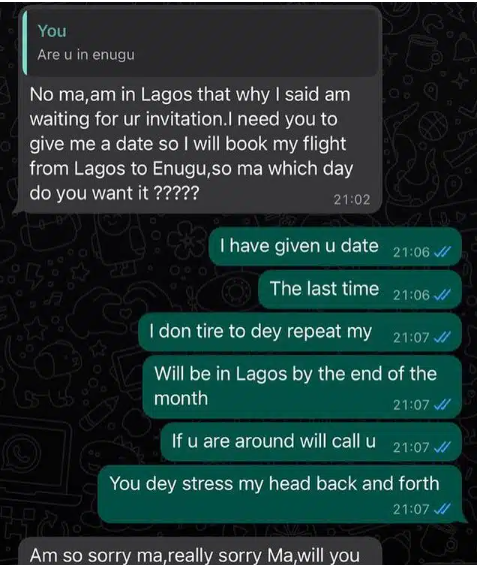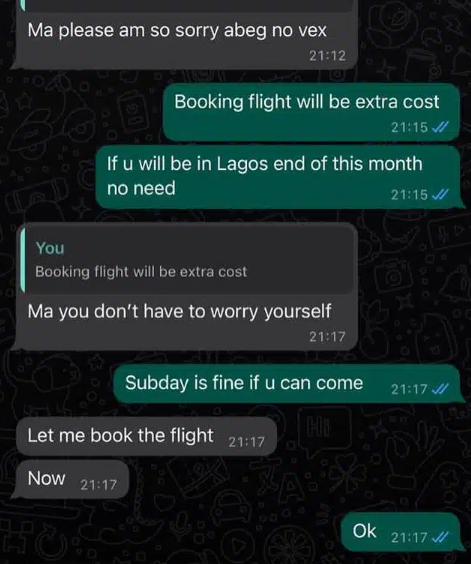 Clarifying the claims, Blessing CEO revealed that the tattoo artist chose to fly to Enugu despite her request that he wait until she returned to Lagos.