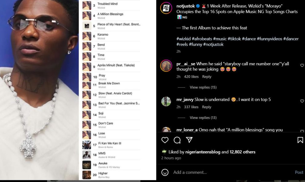 Additionally, one week post-release, Wizkid’s “Morayo” occupies all Top 16 positions on the Apple Music NG Top Songs Charts, marking it as the first album to achieve this feat.