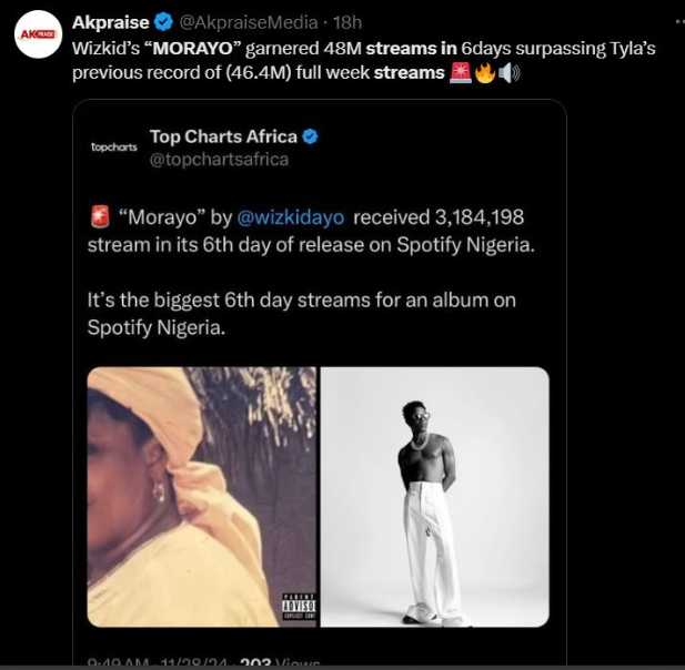 - Wizkid’s sixth studio album, Morayo, was released on November 22nd, 2024, and has already surpassed 48 million streams in just six days.