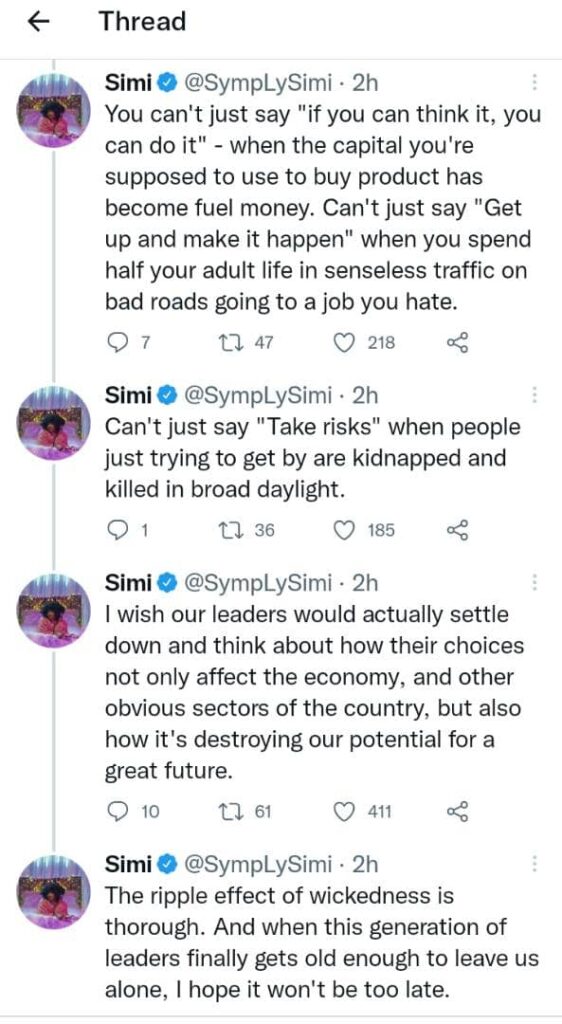 Simi just added that you can’t just tell someone in Nigeria now that if you can think it, then you can do it because the capital supposed to use to buy products for that has become fuel money and you spend half your life in senseless traffic on bad roads.