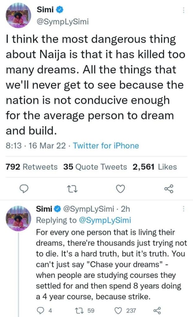 According to Simi, too many dreams are being killed and they won’t be able to see all they wanted to achieve because the nation is not conducive enough for the average person to dream and build and people are now trying just not to die.