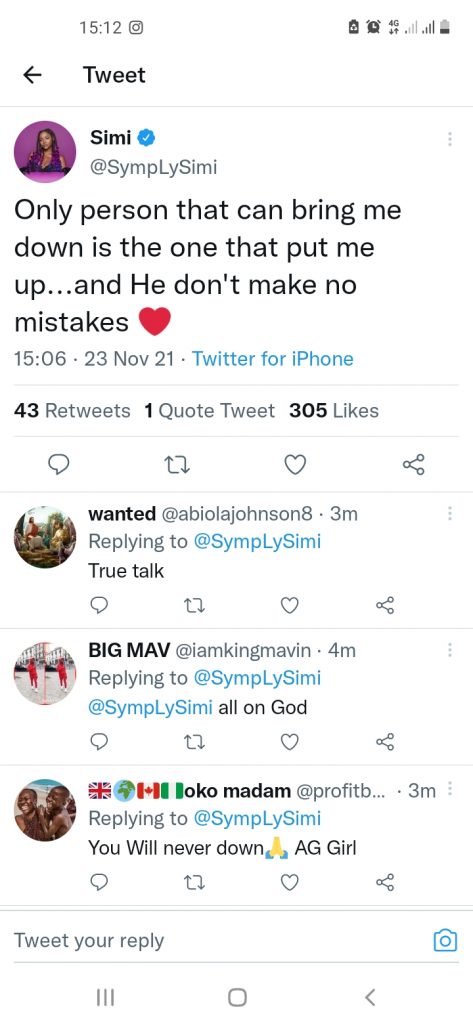 Simi might have made this post based on something she has heard or seen or basically just want to remind those who wish to see her drag down that there’s no way that is going to happen because the person that put her up there is not bringing her down.