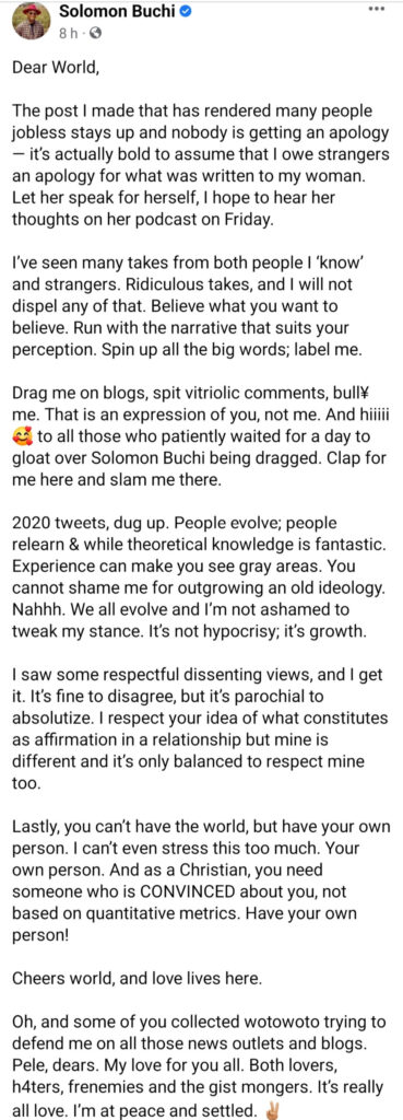 Popular Online life coach Solomon Buchi has said he will not apologise for his viral post about his fiancee.