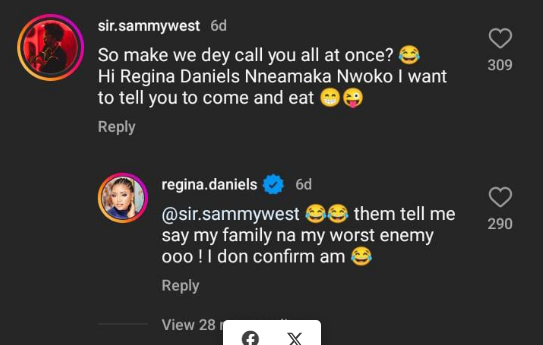 “@sir.sammywest 😂😂 them tell me say my family na my worst enemy ooo ! I don confirm am 😂,” she wrote.