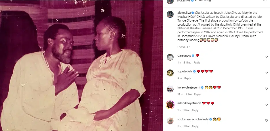 Disclosing the information on her Instagram page moments ago, Joke Silva stated that the stage play titled ‘Holy Child’, which was written by Olu Jacobs and featured them as a couple was first performed in 1986 and also in 1987 and 1993.
