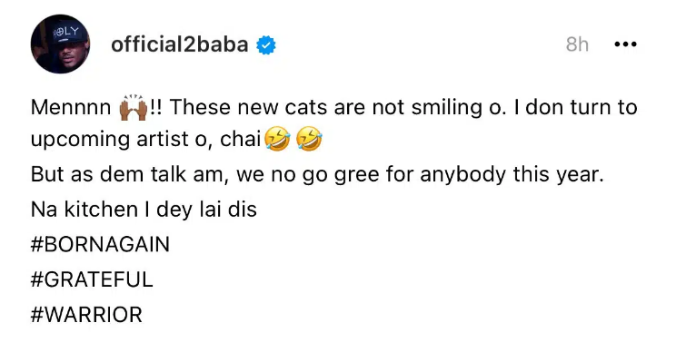 On his Instagram handle, the popular musician wrote: “Meeen!, These new cats are not smiling o. I don turn to upcoming artist o, chai. But as them talk am, we no go gree for anybody this year. na kitchen I dey like this.”