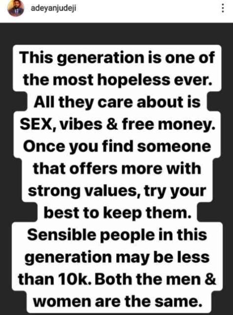 According to him, all they care about is s3x, vibes and free money. Deji said this on his Instagram  page.