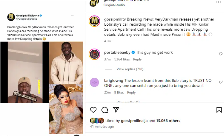 It is worth noting that the activist recently utilized his Instagram account to share another audio recording in which Bobrisky detailed his experiences during detention and interactions with the EFCC. Portable, finding this behavior troubling, has expressed his disapproval of Verydarkman.