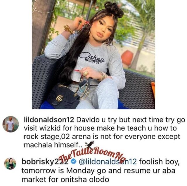 Popular Nigerian crossdresser, Bobrisky has slammed a troll who asked Davido to go to Wizkid and learn how to rock the stage as the O2 Arena is not for everyone except Wizkid himself.