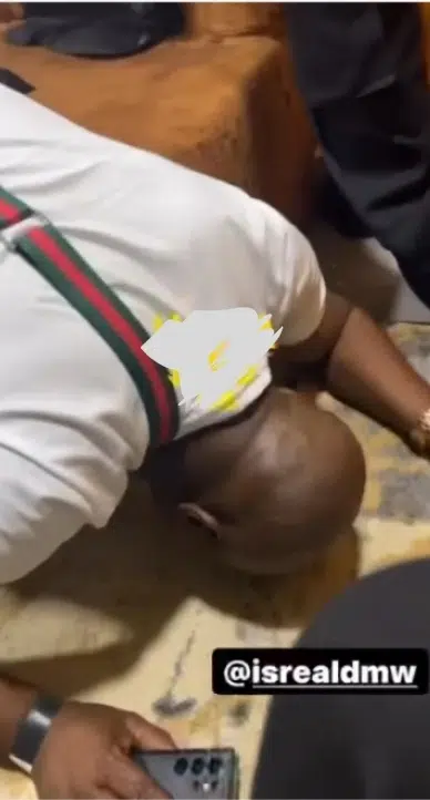 Personal logistics manager to Nigerian award winning Singer, Isreal DMW who recently cried out over the cost of his wedding suit has been captured on camera bowing down in worship of his boss.
