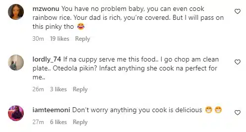 Billionaire’s heiress, Florence Otedola, alias DJ Cuppy, shows off her cooking skills after making a yummy plate of jollof rice.