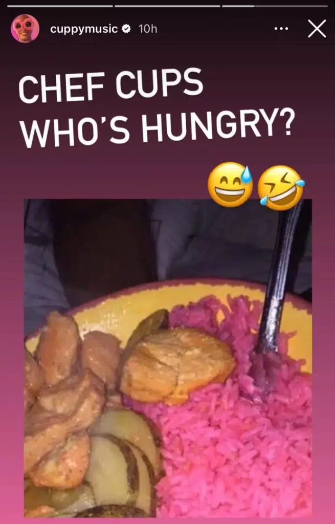 • Dj Cuppy shared a photo of a pink-coloured plate of jollof rice with steak and potatoes