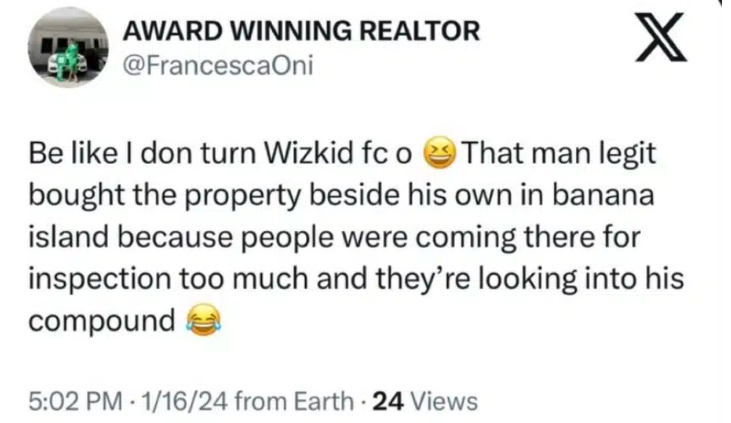 “Be like I don turn Wizkid fo o That man legit bought the property beside his own in banana island because people were coming there for inspection too much and they’re looking into his compound”