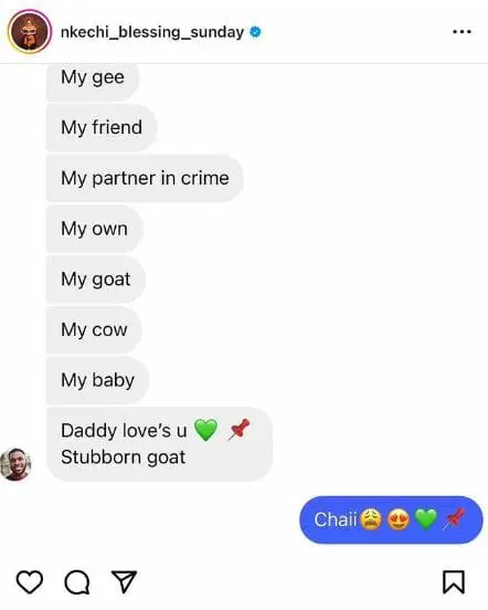 In the screenshot, Xxsive showered Nkechi Blessing with several sweet names. He went as far as adding some animal names such as goat, and cow.